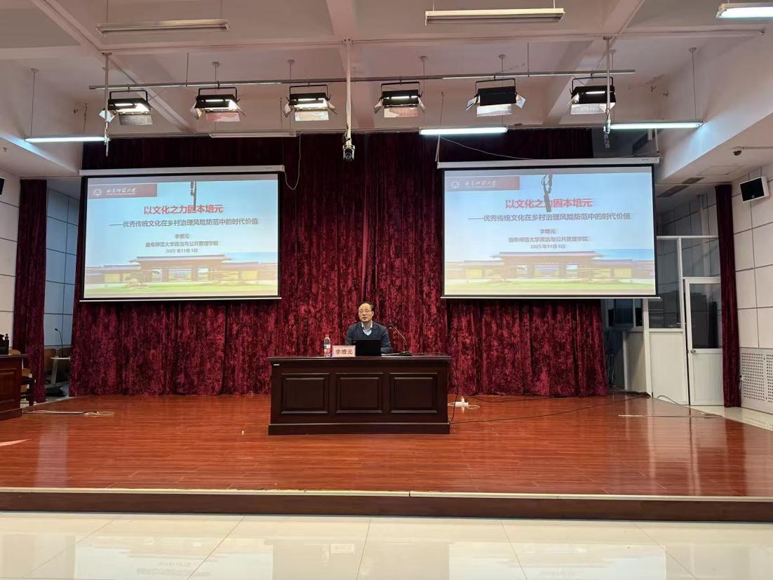 学院党委副书记、院长李增元围绕以文化之力固本培元——优秀传统文化在乡村治理风险防范中的时代价值主题,从乡村社会治理面临的四大风险出发,深层剖析风险背后的文化症结,提出了文化嵌入乡村社会治理固本四策,深入挖掘优秀传统文化在乡村治理风险防范中的时代价值,使得同学们了解到优秀传统文化对于乡村治理的重要性。